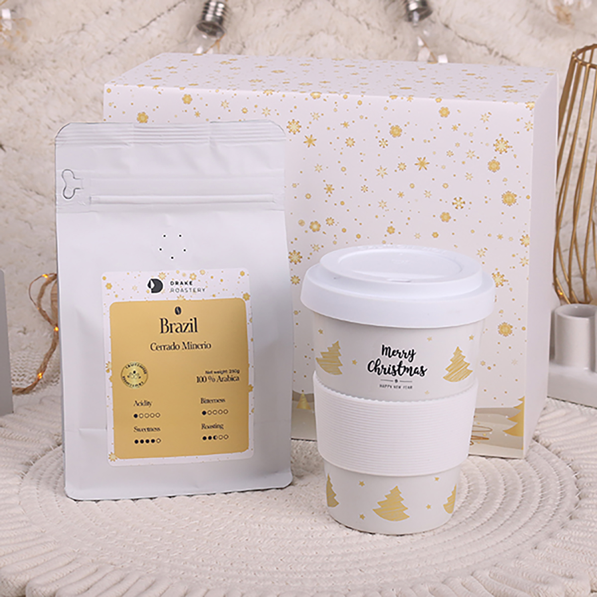 I chicchi di caffè artigianale Arabica Brazil Cerrado Mineiro 250g vi riscalderanno meravigliosamente nelle lunghe serate invernali. Anche la confezione del caffè può essere personalizzata.