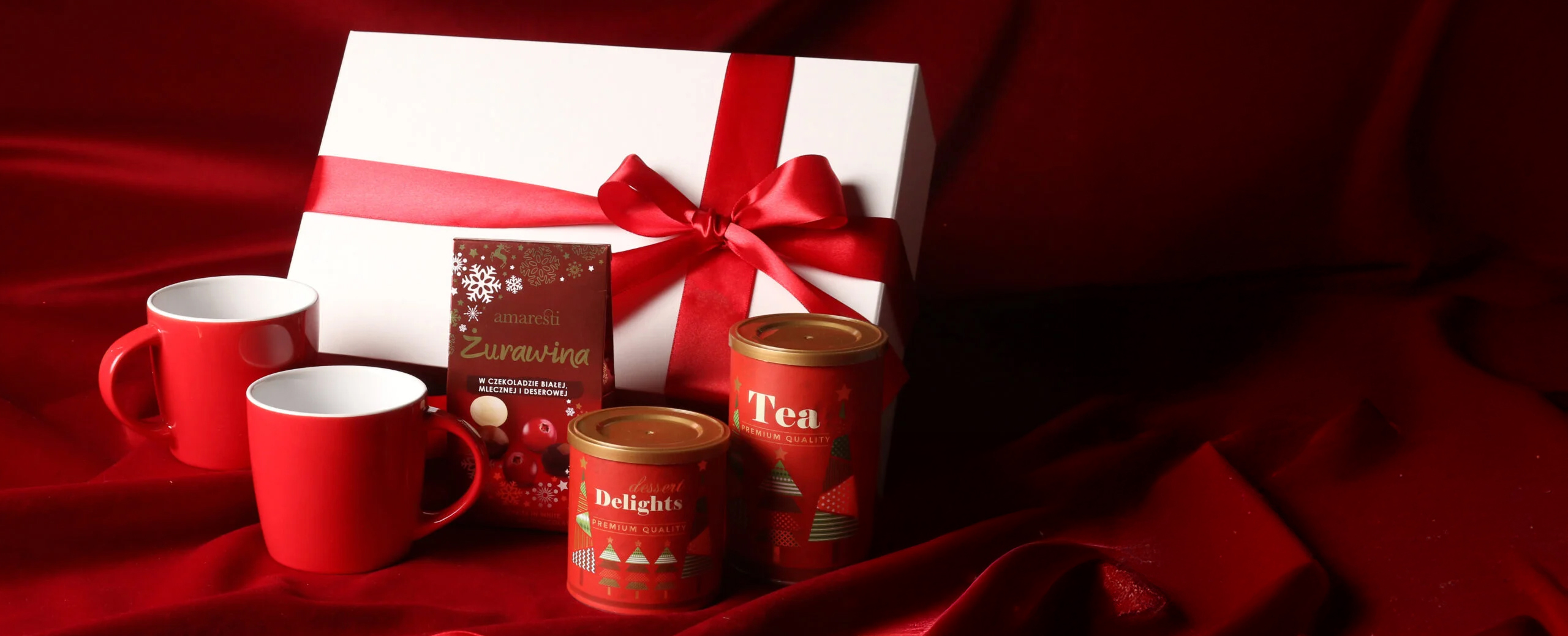 Arricchisci il tuo regalo con caffè, tè o cioccolato aromatici in lattine con il marchio invernale. Completa il set con squisiti dolciumi di alta qualità, creando un’esperienza di gusto indimenticabile.