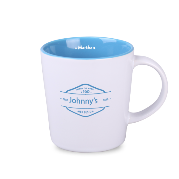 Tazza classica con ampie possibilità di personalizzazione. Ha un interno in diverse tonalità di tendenza. Le sue grandi pareti lisce esalteranno perfettamente la stampa applicata.