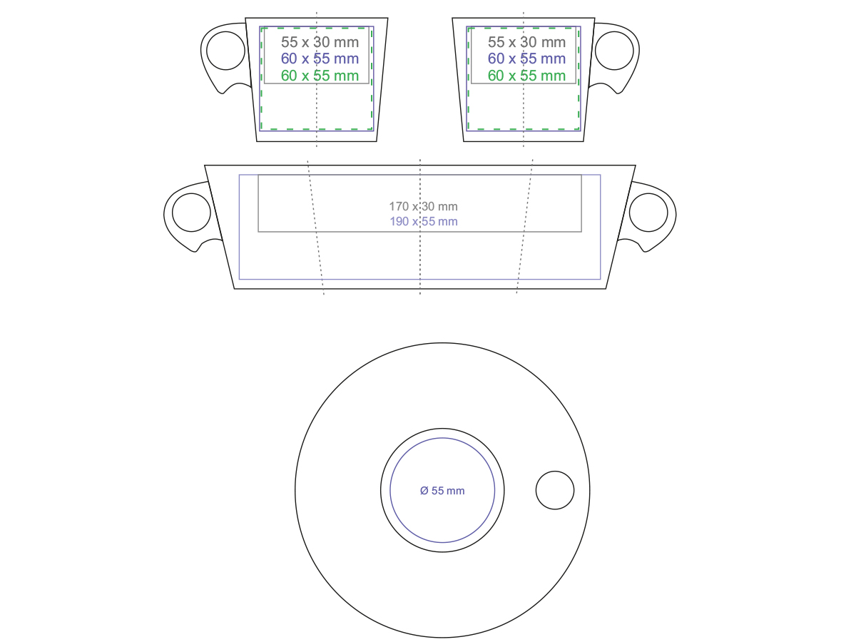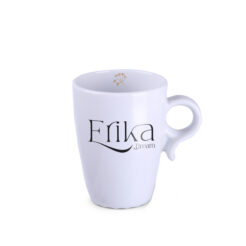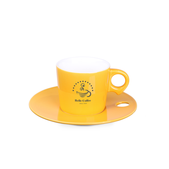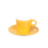 Tazza colorata e accattivante in porcellana. Ha una forma interessante e un manico di design che corrisponde al piattino.