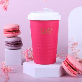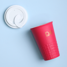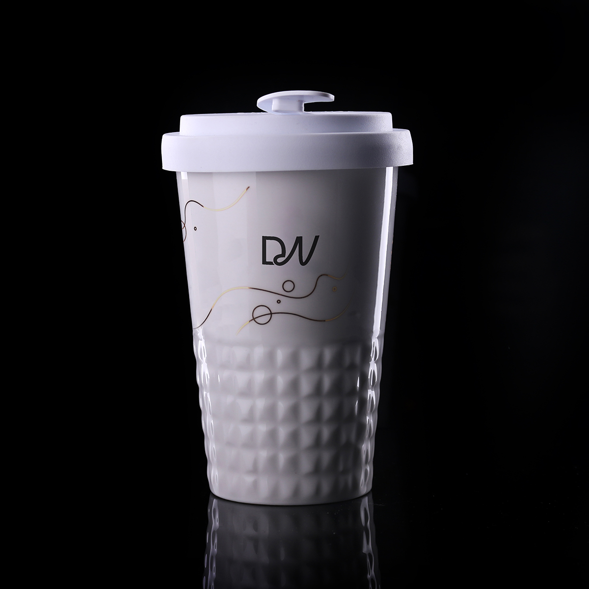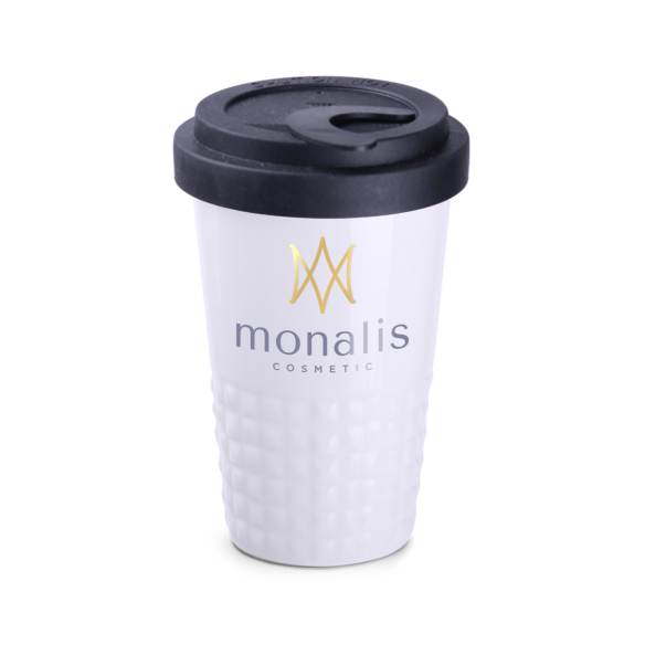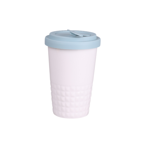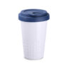 Tazza mobile di design realizzata in porcellana. Presenta una caratteristica finitura della parte inferiore a forma di sporgenze. Il modello e destinato a persone attive, amanti di viaggi e spostamenti. Grazie alla rara struttura interna a doppia parete in porcellana, e caratterizzata da un maggiore livello di isolamento termico. Ha un coperchio con tappo a tenuta, disponibile in colori.