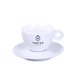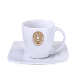 Un’elegante tazza in porcellana abbinata a un piatto dedicato. Cio che contraddistingue questo set e la delicata finitura quadrata visibile nella parte inferiore della tazza.