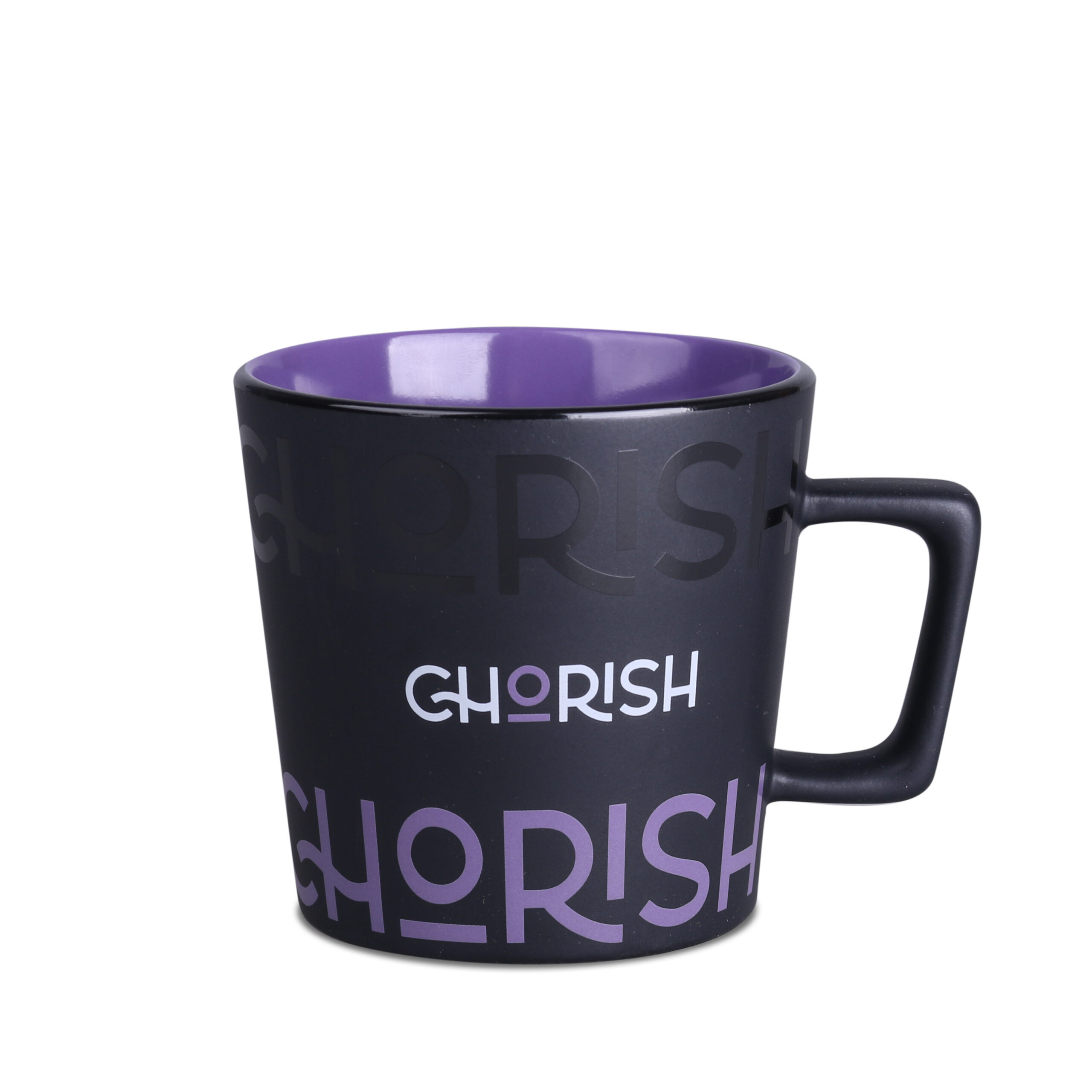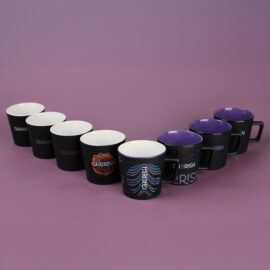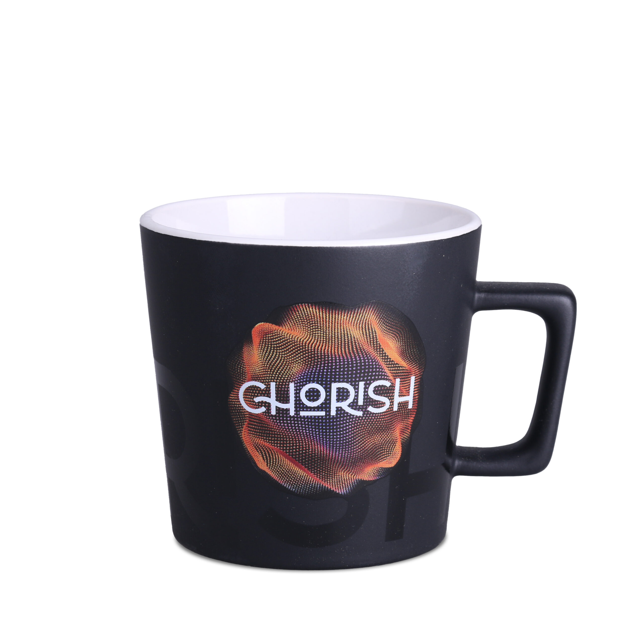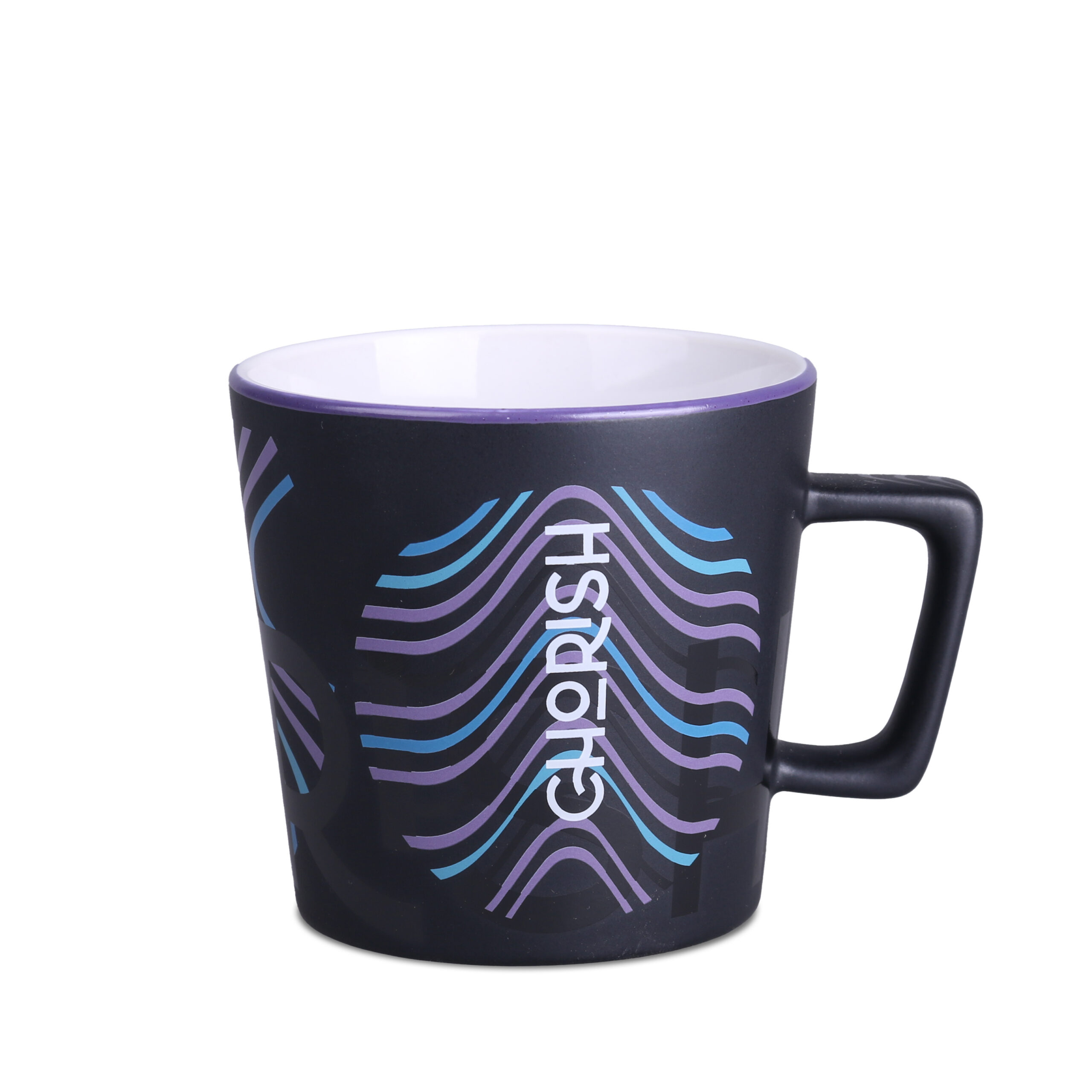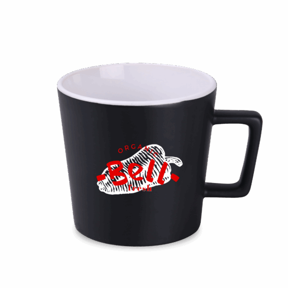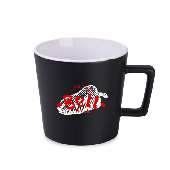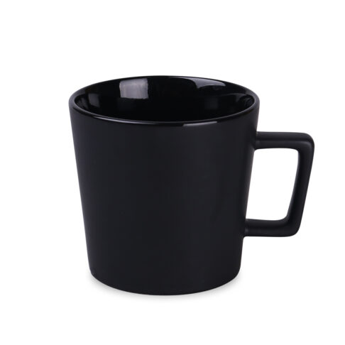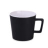 Tazza moderna con superficie nera opaca. Presenta un manico dalla forma interessante e di design. Disponibile con interni in vari colori.