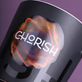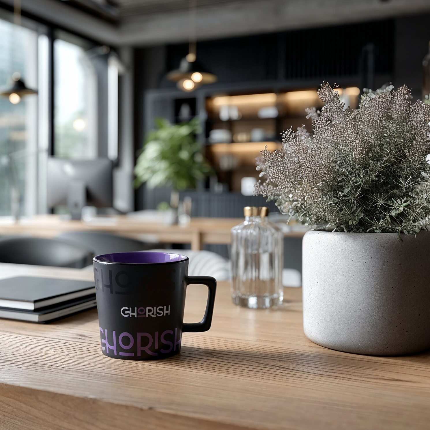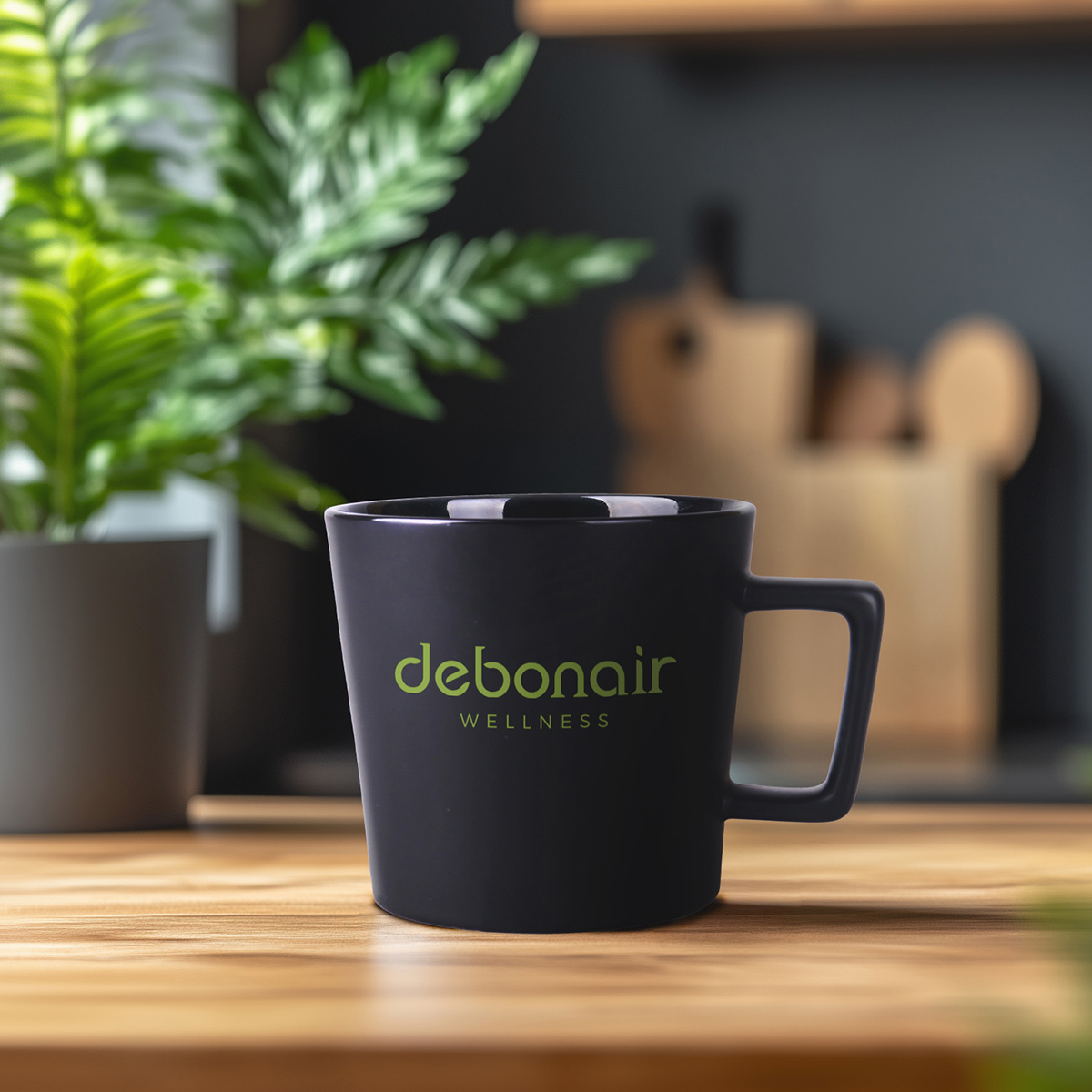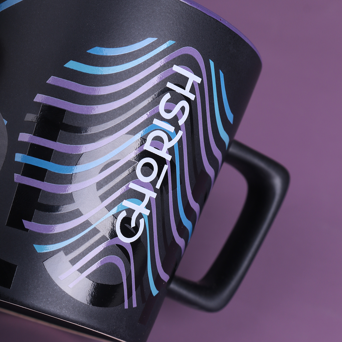 Tazza moderna con superficie nera opaca. Presenta un manico dalla forma interessante e di design. Disponibile con interni in vari colori.