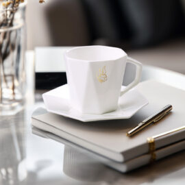 Bellissima tazza geometrica realizzata in porcellana Fine Bone China di altissima qualità. Include un piattino perfettamente abbinato. Appartiene alla linea Prestige. Perfetta in abbinamento con la tazza Tiara.